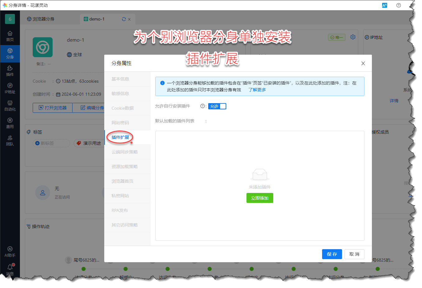 您也可以为个别浏览器分身单独安装插件扩展,只需要在分身属性的 “插件扩展” 页签中,点击 “立即添加” ,然后选择适合的插件即可:
