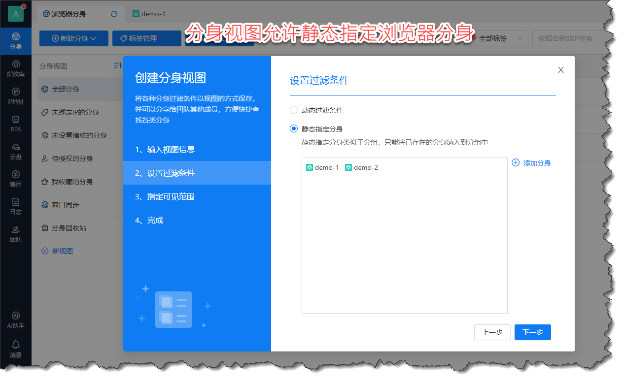 当浏览器分身/IP过多时,通过创建分身/IP视图能够对浏览器分身/IP进行良好的组织。本版本针对分身/IP视图新增 “静态指定资源” 的方式,允许用户将指定的浏览器分身/IP加入到某个视图中:
