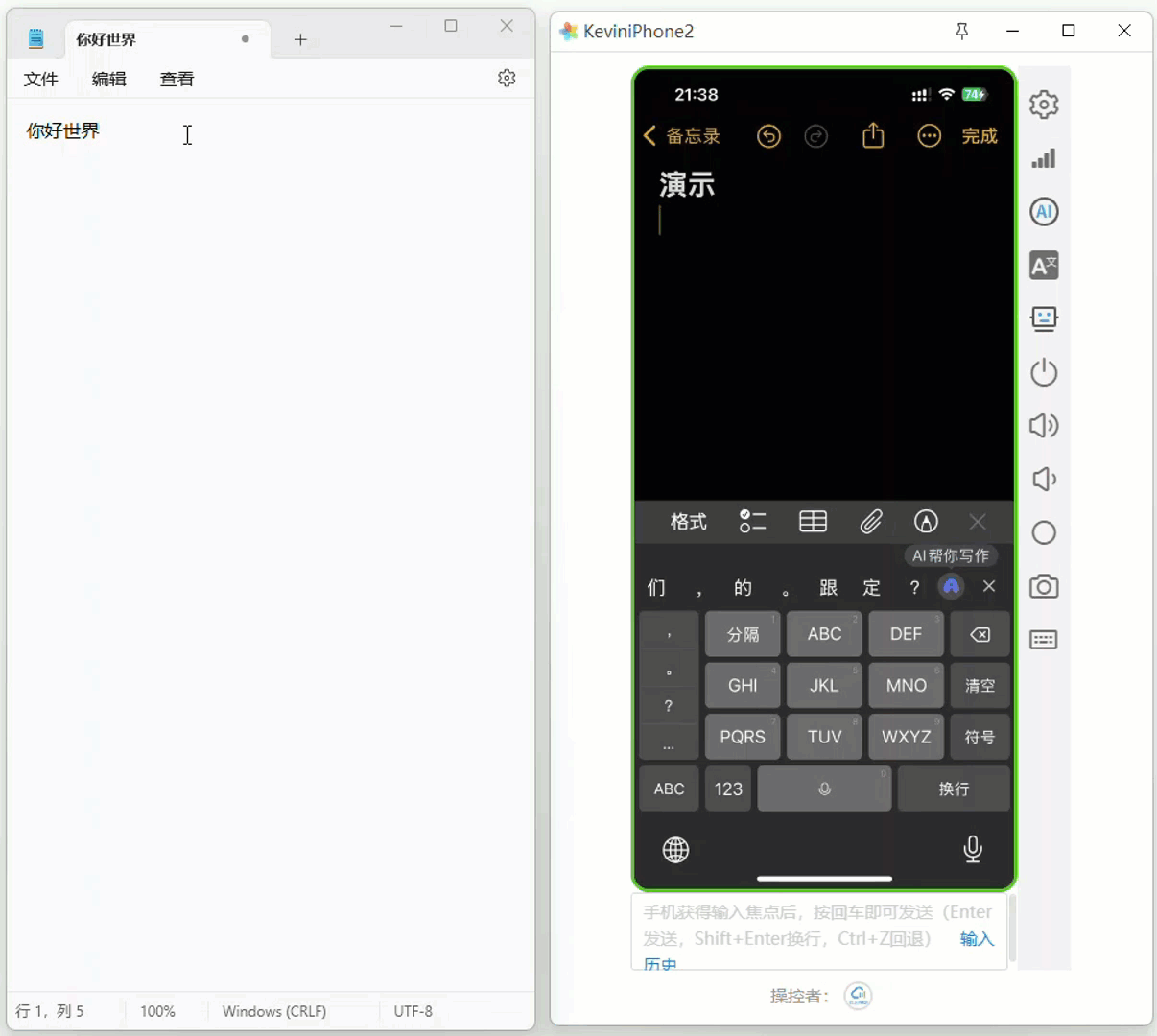 然后,您就可以在手机中直接使用电脑的输入法进行文本的录入了,如下图所示,您可以使用电脑的输入法(如五笔输入法),直接在手机中进行中英文的录入: