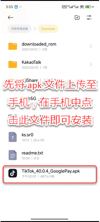 如果您已有 apk 文件,请先将 apk 文件上传至手机,然后在手机中浏览到 apk 文件,点后后即可安装,如下图所示: