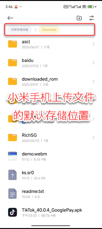 目录,以小米手机为例,您需要打开“文件管理”应用,上传后的文件(非图片/视频文件)位于:内部存储设置\Download