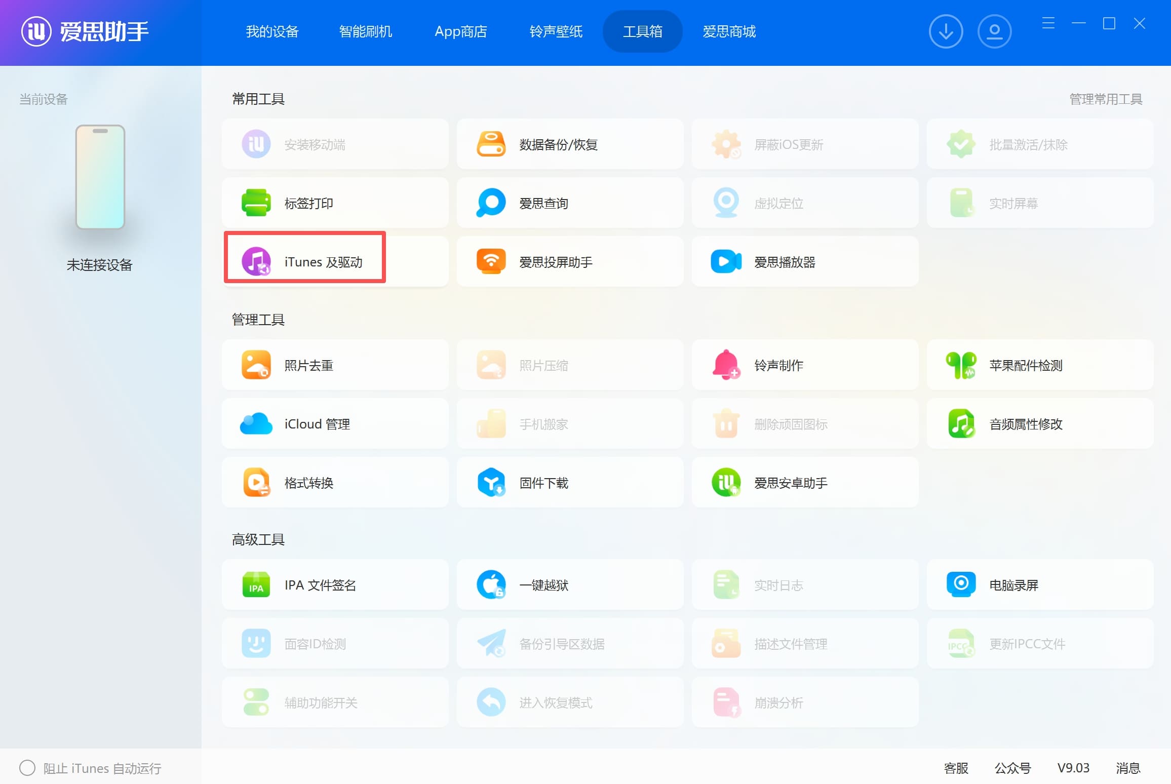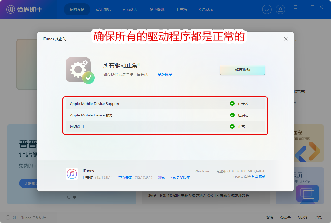一:通过爱思助手检查电脑上的苹果驱动是否正常: 请在电脑中下载并安装 爱思助手,其下载链接为 www.i4.cn。安装成功后,请打开爱思助手,点击 “工具箱” => “iTunes及驱动”: