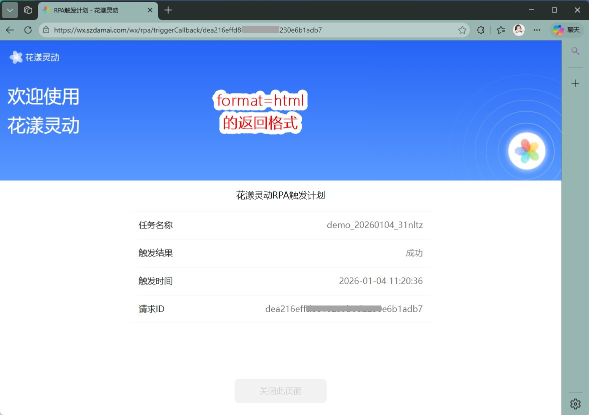 此时,如果我们再次访问上述带有相同 clientToken 的 URL (或者说,在刚才的浏览器中进行F5刷新),可以看到,系统访问的结果不会发生变化, 换言之,因为我们带有相同的 clientToken=0001,花漾RPA会认为:用户希望触发同一个流程任务,因此,返回上次请求中已经创建的流程任务的结果, 而并不会创建新的流程任务: