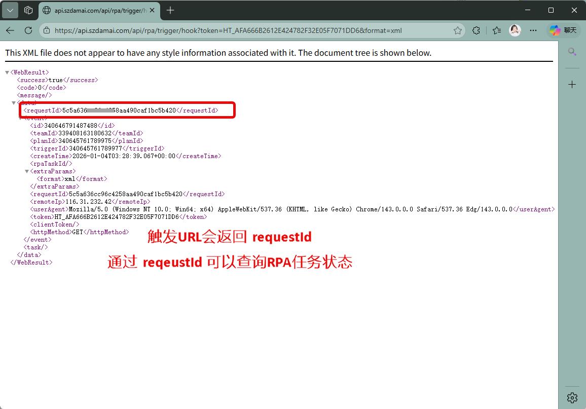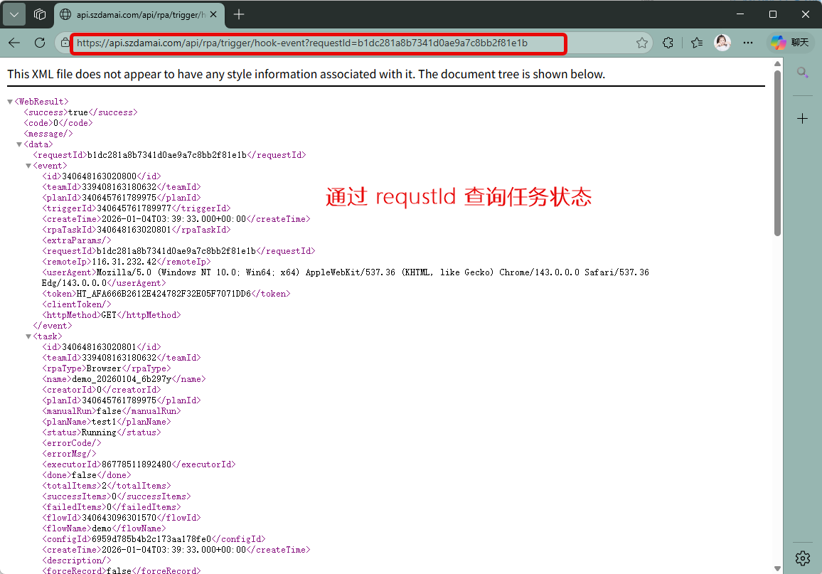 通过此 requestid,可以查询 RPA 任务状态,其查询 URL 为: