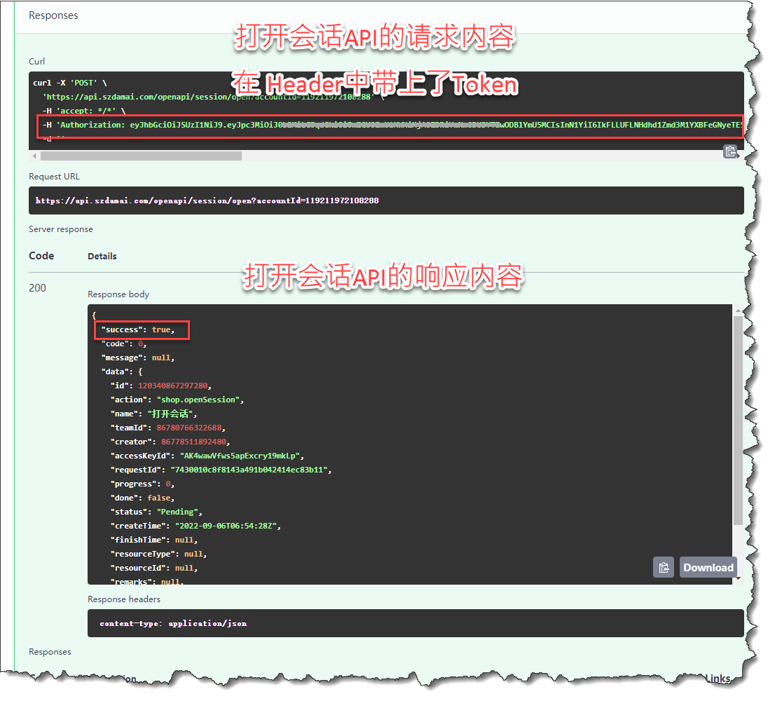 当点击“Execute”后,可以看到网页中会显示刚刚发送的Http请求以及收到的响应,在响应结果中,那一长串绿色的编码,既是我们所谓的“Token”: