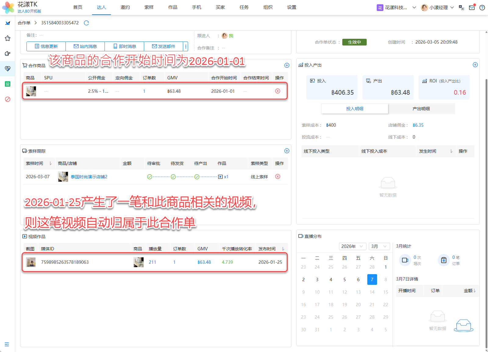 我们以下图为例,在该合作单中,引入了一个合作商品,其合作开始时间自 2026-01-01,在 03-07 该达人针对该商品申请了一个样品,那么,该索样记录会被自动归属到该合作单中。