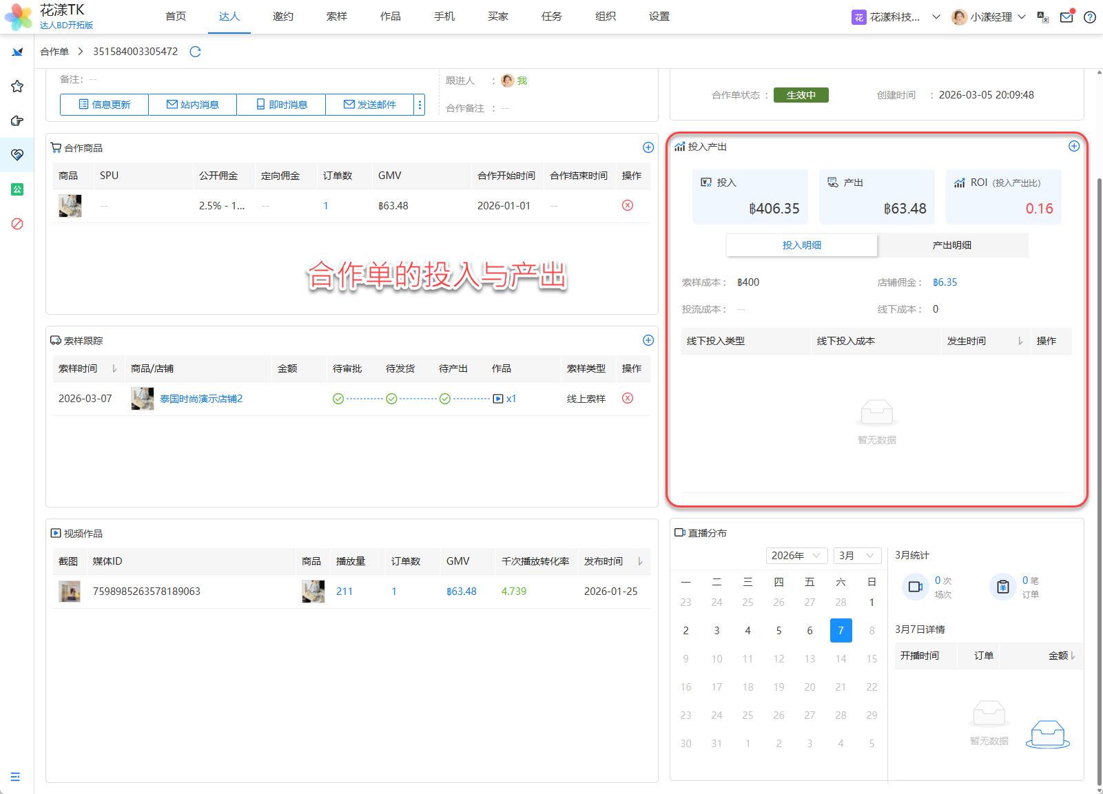 合作单生效后,便可以记录 达人、BD、商品、合作时间 等各个维度的关系,我们可以在合作单的详情页面中查看具体的细节。