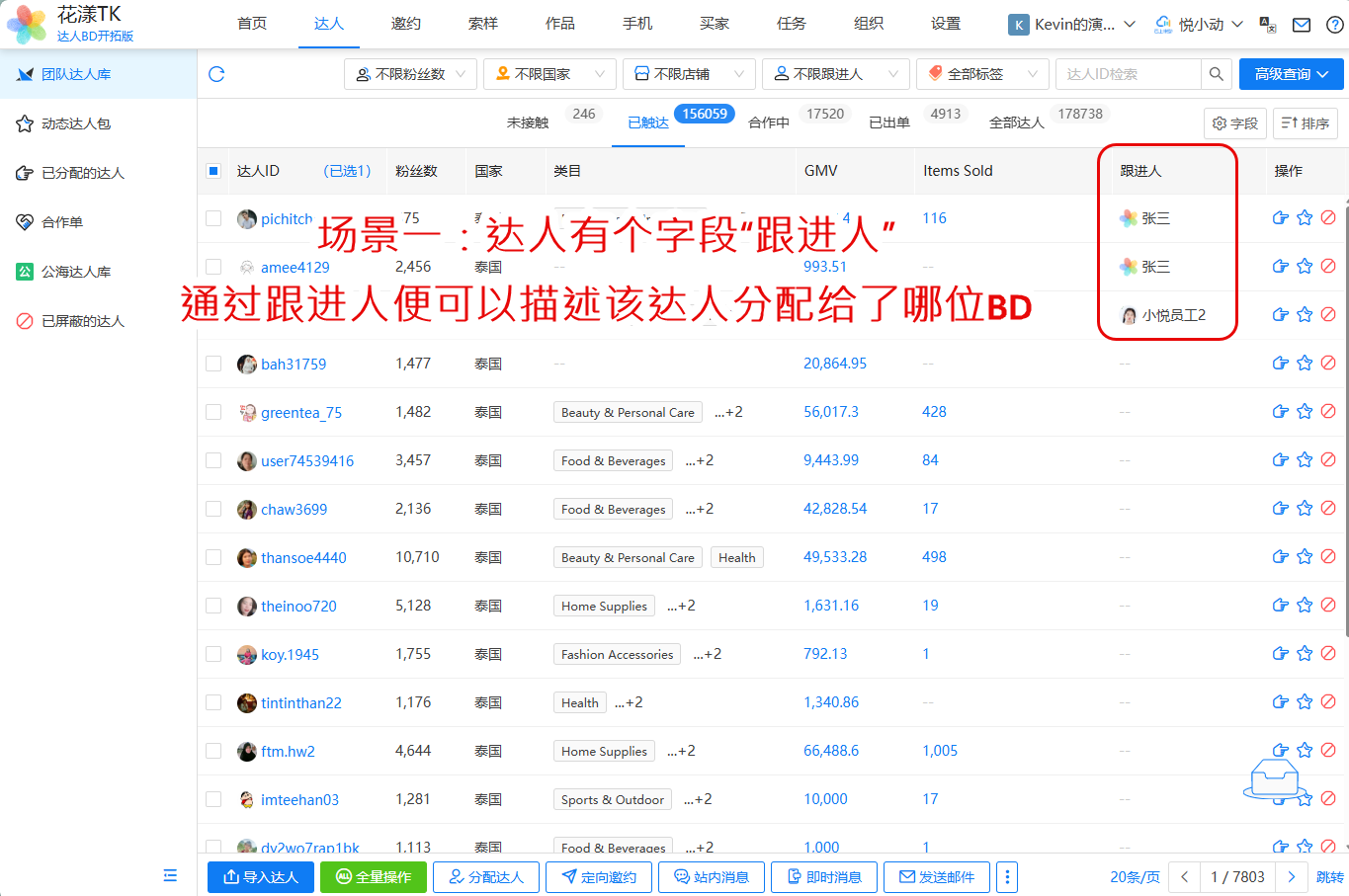 很多公司会将达人分配给商务拓展人员(以下简称 BD),由 BD 负责该达人的商务合作对接,您可以决定是否要在花漾TK系统中开启此特性,前提是您购买的是 “BD开拓版” 套餐版本。