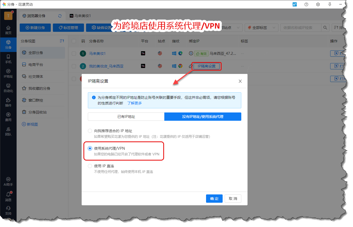 如果您能够正常访问跨境店铺后台且操作体验比较流畅,可以设置店铺的IP隔离为“使用本机IP直连”,如下图所示: