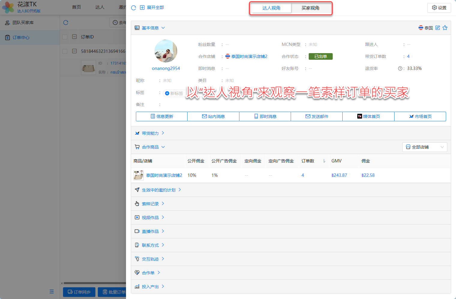 我们知道,无论达人还是买家,本质上都是一个 TikTok 用户,只不过从“达人”或者“买家”不同的视角来观察而已。在花漾TK中,我们可以随时切换“达人”或者“买家”的视角。举例,一笔索样订单,其“买家”就是“索样达人”,如下图所示: