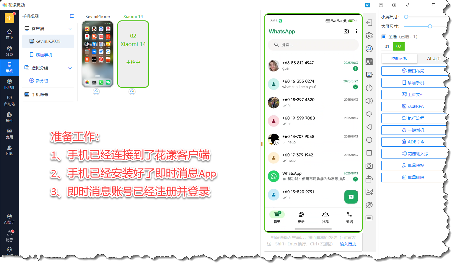 点击“确定”后,系统会创建一笔流程任务放到任务池中,稍待片刻,可以看到手机开始执行“手机即时消息_添加好友”的流程,自动将上述达人的 Whatsapp 账号添加为好友:
