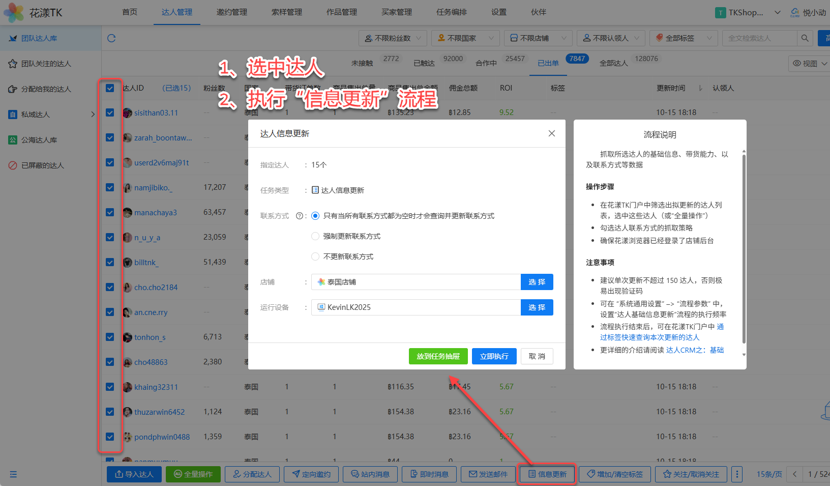 在将达人加为您的即时消息好友之前,您需要知悉达人的联系方式,您可以通过执行“达人信息更新”流程,从达人市场页面中抓取达人留下的联系方式,具体做法如下: