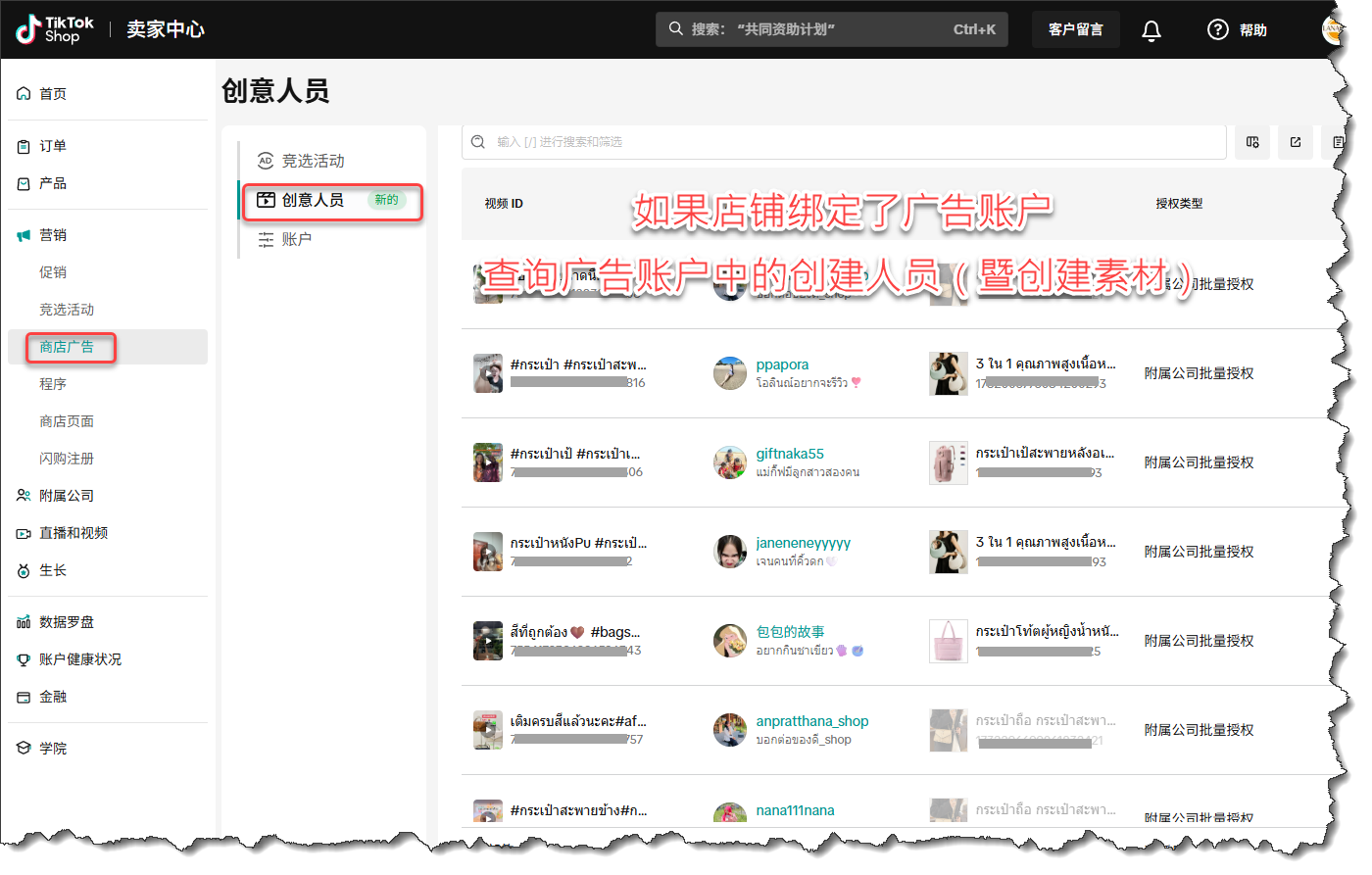 如果店铺开了广告账户,查询绑定的广告账户的投流素材: