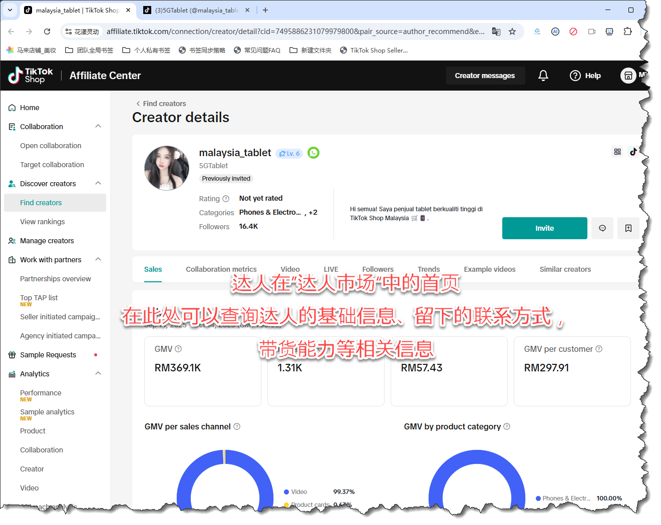 市场首页,暨在 TikTok 店铺后台的 Find creators 页面中查询到的达人详情页面,在此页面中可以查询达人的基础信息(如昵称、粉丝数、类别等)、留下的联系方式(如email、Whatsapp、Line等)、以及带货能力(如达人产出的GMV、Items Sold)等相关数据: