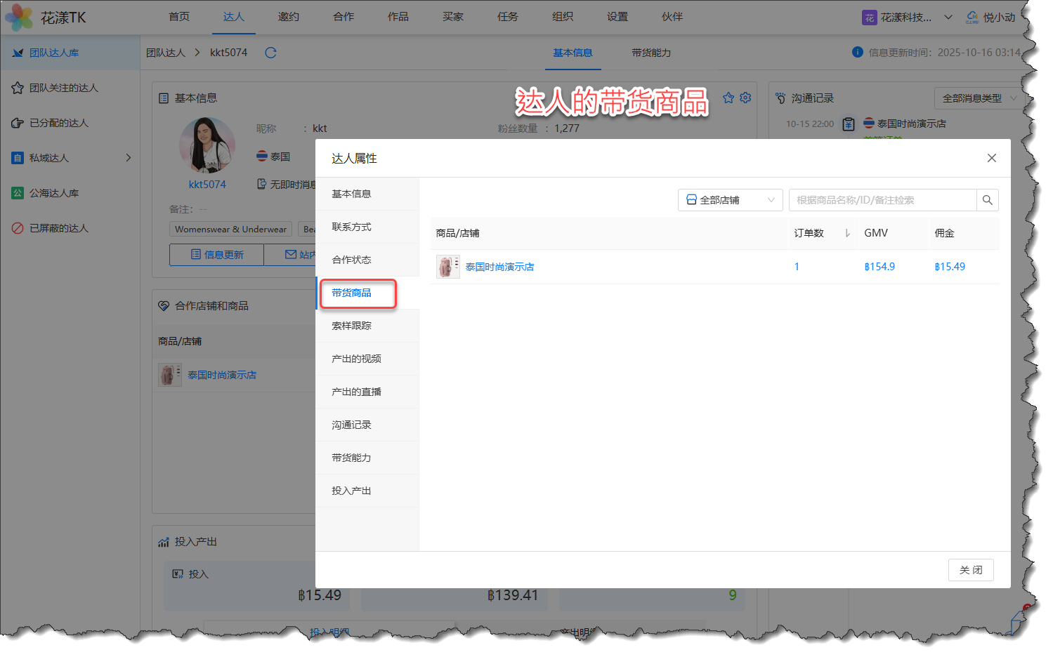 我们可以在达人的详情页面,或者达人的属性对话框,查询到达人的带货商品与产出作品: