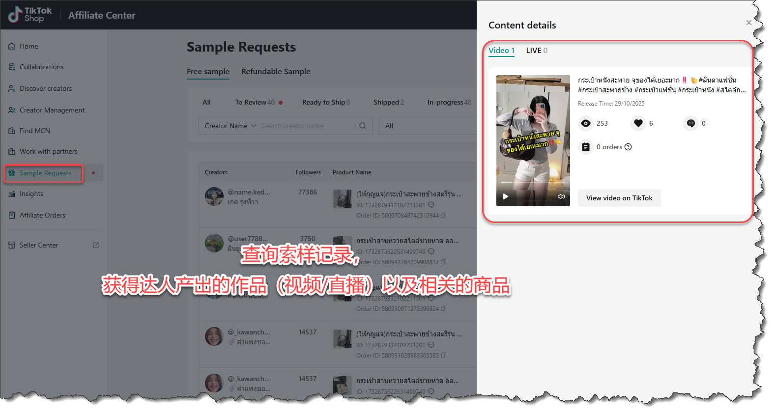 查询店铺后台的达人索样记录,索样记录里有达人产出的带货视频或直播: