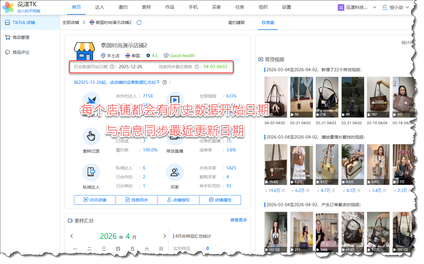这是因为如果您的店铺的数据量非常大,花漾TK并不能一次性把店铺后台所有数据都抓取过来进行分析,因此,在首次执行店铺信息同步流程时,花漾TK会根据店铺联盟订单数量的多少确定该店铺的 “历史数据开始日期”,从该日期开始之后的数据,花漾TK能够保证数据是完整的、连贯的,前提是:您需要在后续每天执行一次“店铺信息同步流程”。