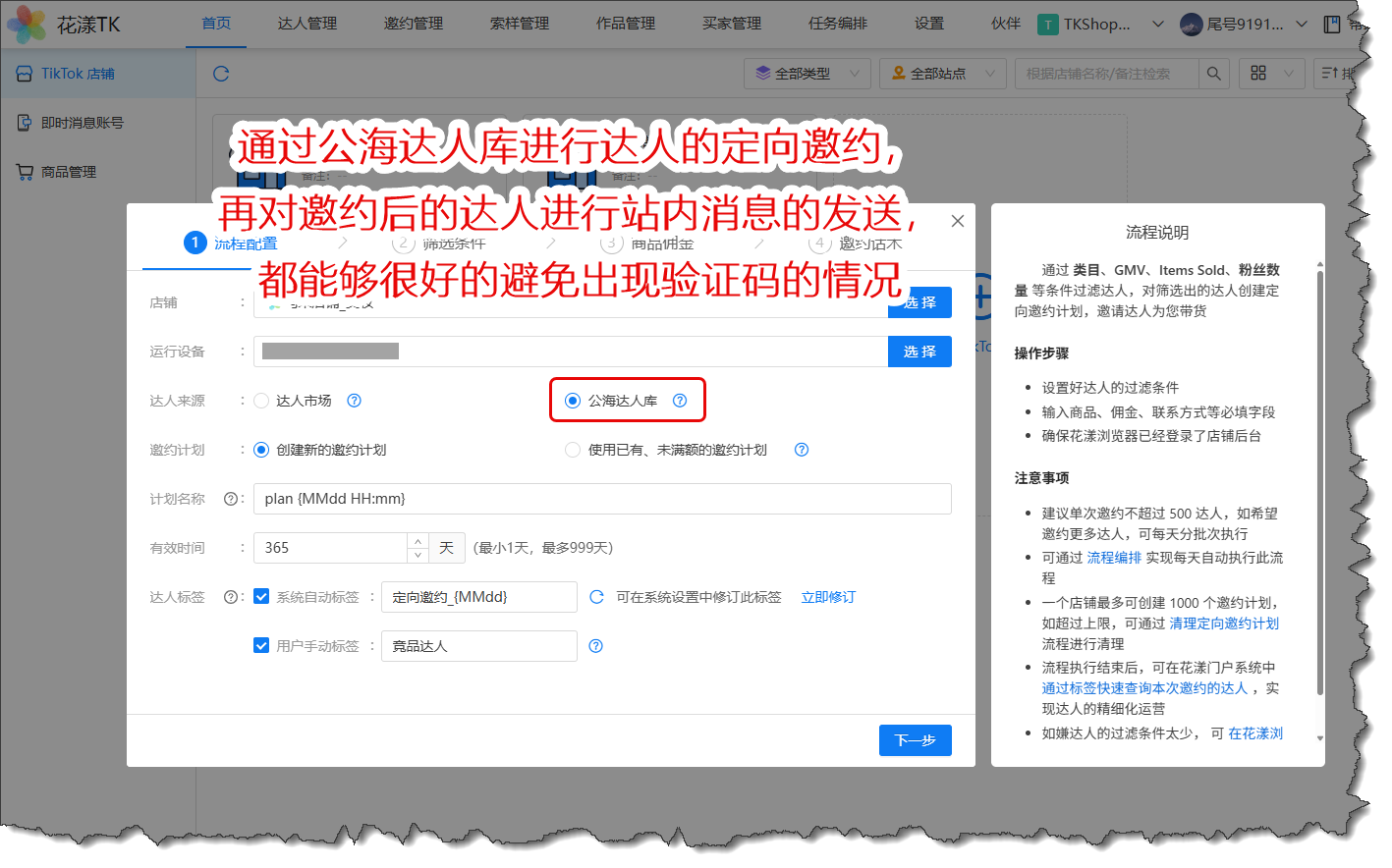 最后需要提醒您的是,如果您是做达人的定向邀约,可以使用花漾为您提供的公海达人库进行邀约,这样避免访问店铺后台的达人市场,也能够很好的规避频繁出现验证码的情况,使用方法如下图所示: