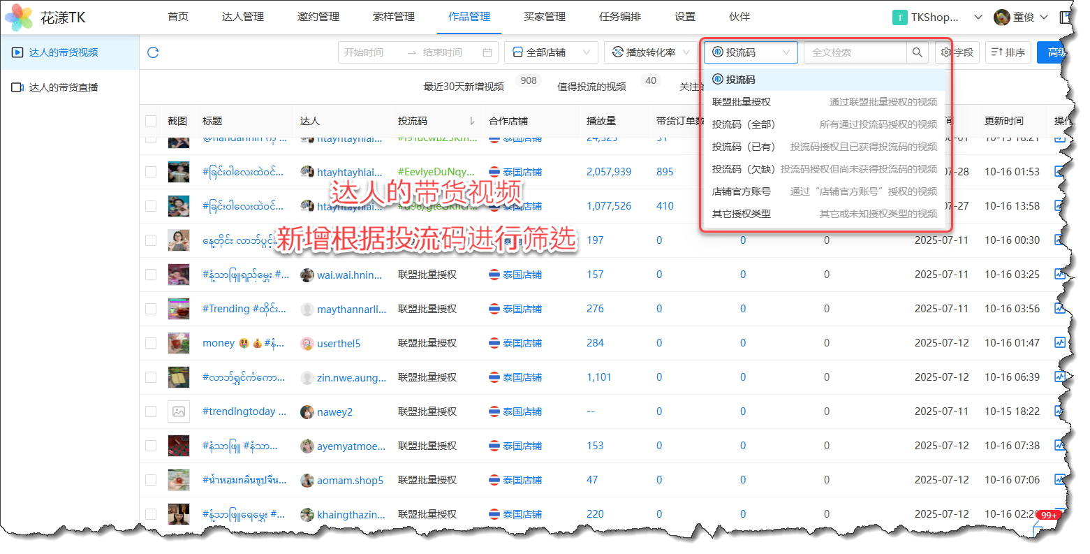 本版本支持通过“投流码”对达人的带货视频进行筛选: