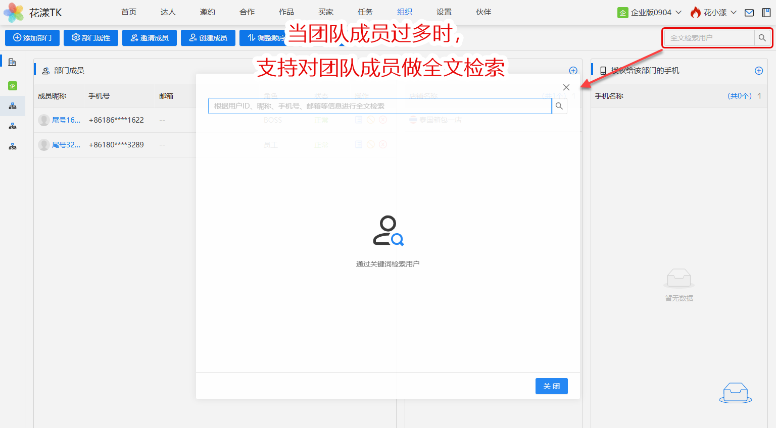 花漾TK门户新增一级菜单“组织”,通过“组织”页签,能够方便用户快速的的创建团队组织架构、部门成员,并将店铺或手机授权给部门,这意味着部门内的用户能够自动拥有访问这些店铺与手机的能力: