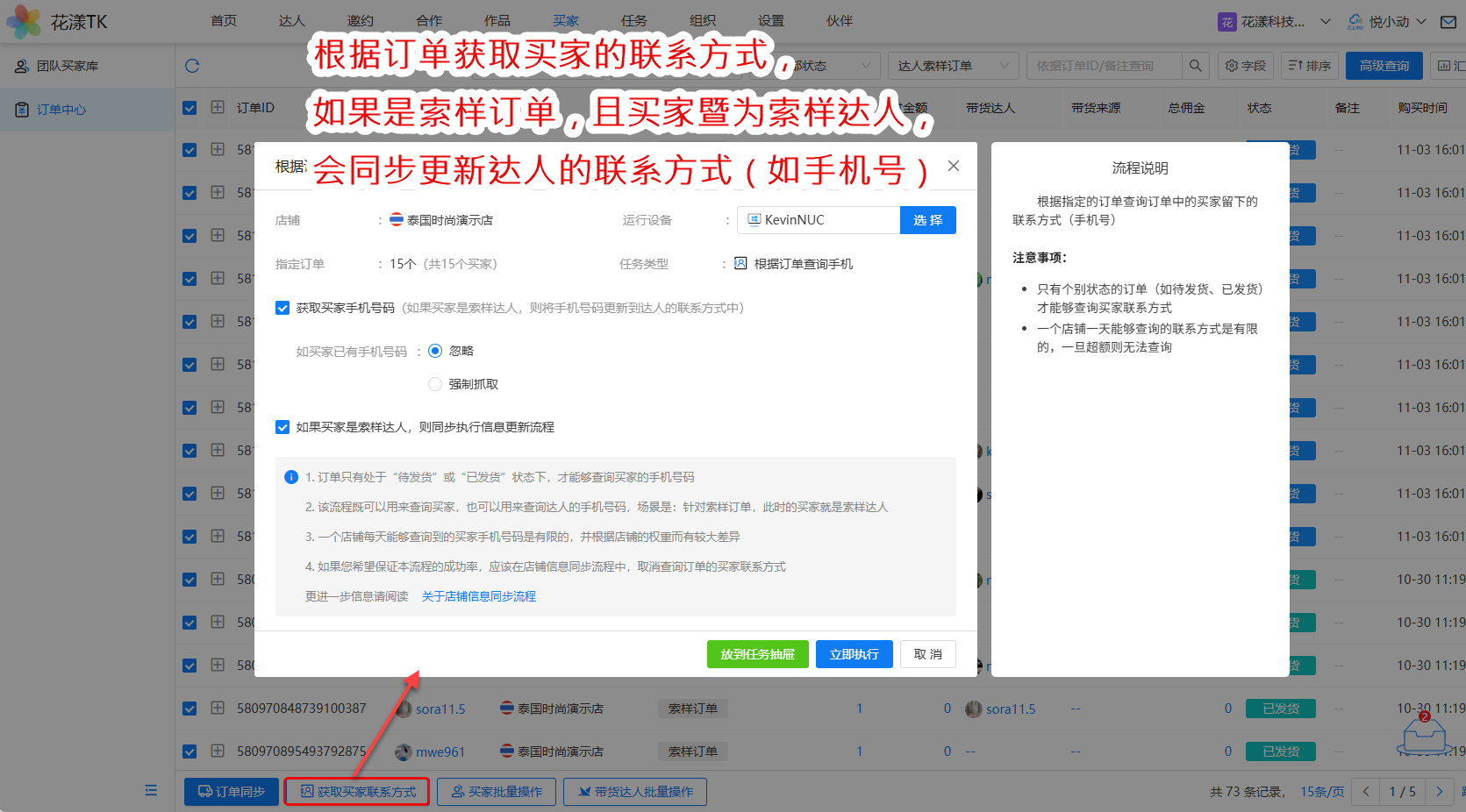 本需求的使用场景是:先在订单中心筛选出“索样订单”,然后通过自动化流程查询索样订单的买家手机号码;因为这些买家本质上就是索样达人,所以,当系统判断买家ID和达人ID是一样的话,会自动将查询出的手机号同步更新到对应的达人属性中----由此,我们便可以通过订单获取到索样达人的手机号码,后续还可以通过手机号码查询达人的 Whatsapp、Line 等联系方式。