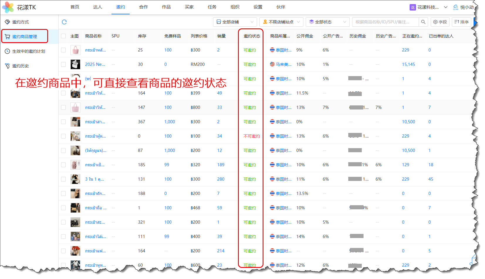 邀约商品管理中,新增字段“邀约状态”,该字段有两个值:“可邀约”或“不可邀约”。其中,“不可邀约”的原因可能是:商品库存为0或者评分较低,具体原因需要到店铺后台查询。