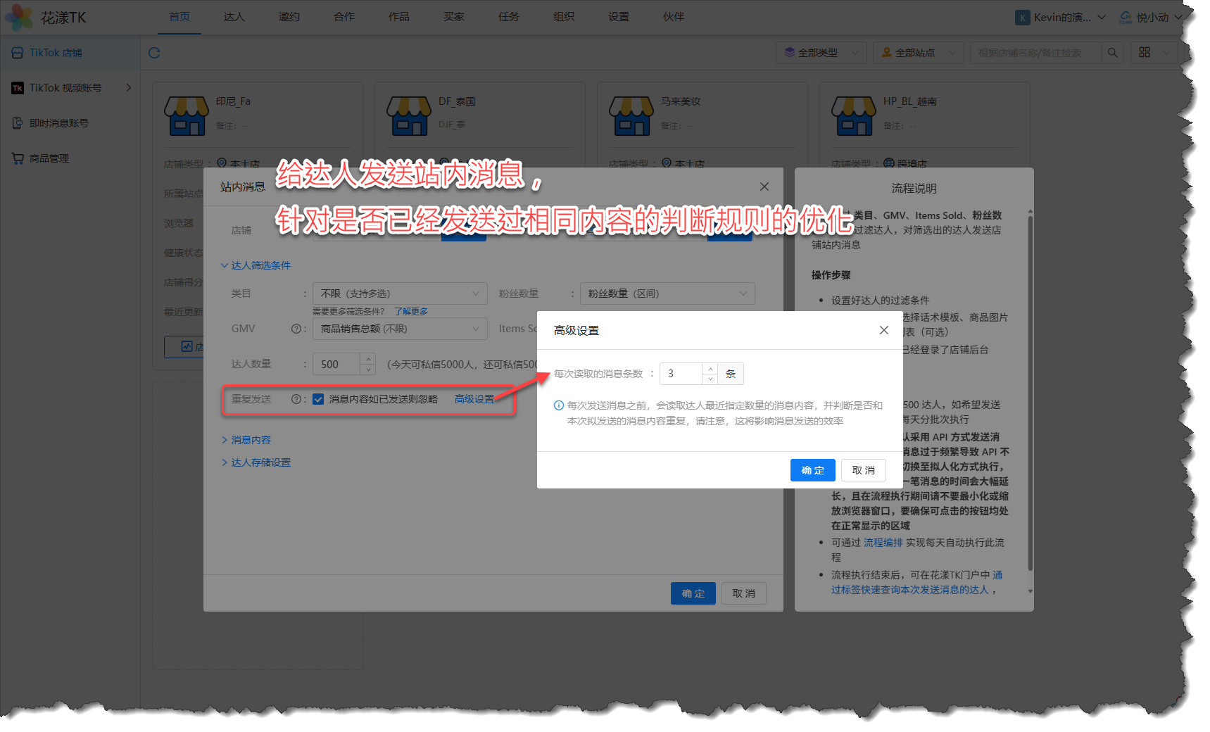当给达人发送站内消息时,新版本会判断是否给该达人发送过相同的消息内容,如果已经发送过,用户可以选择是否忽略此达人: