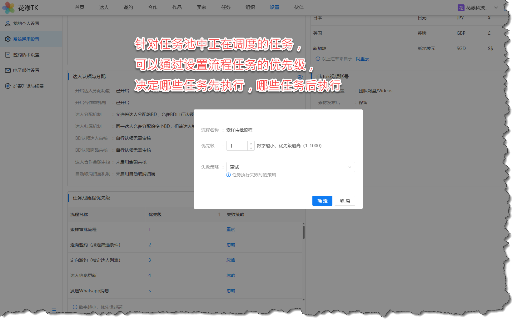 举例,您创建了给1000个达人发送站内消息的任务,又创建了给1000个达人进行信息更新的任务,由于前者的优先级高,因此任务池必须优先处理完前1000个“站内消息”的任务,然后才会执行后续“信息更新”的任务;新版本允许用户自行设置流程任务的优先级与失败策略,这意味着您可以随时调整优先执行哪些流程任务: