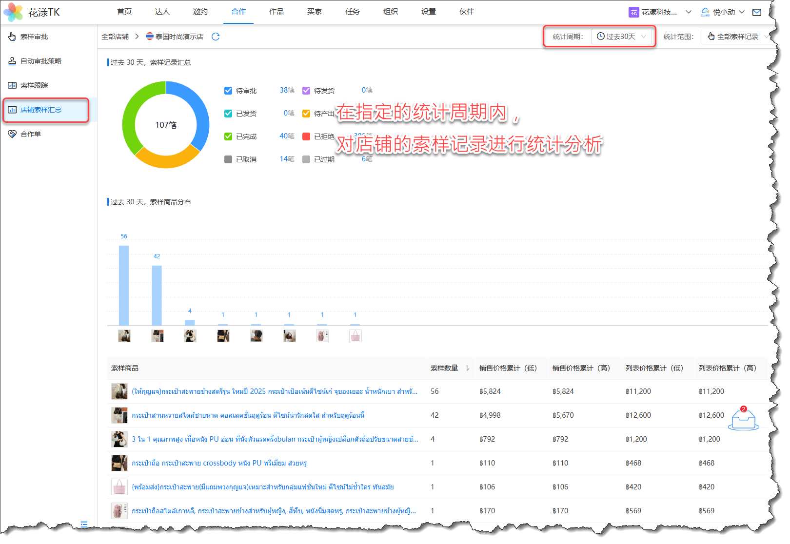 新版本能够在指定的统计周期内,对店铺的索样记录进行统计分析,向用户展示有哪些索样商品,以及这些商品的索样数量、价格分布等等: