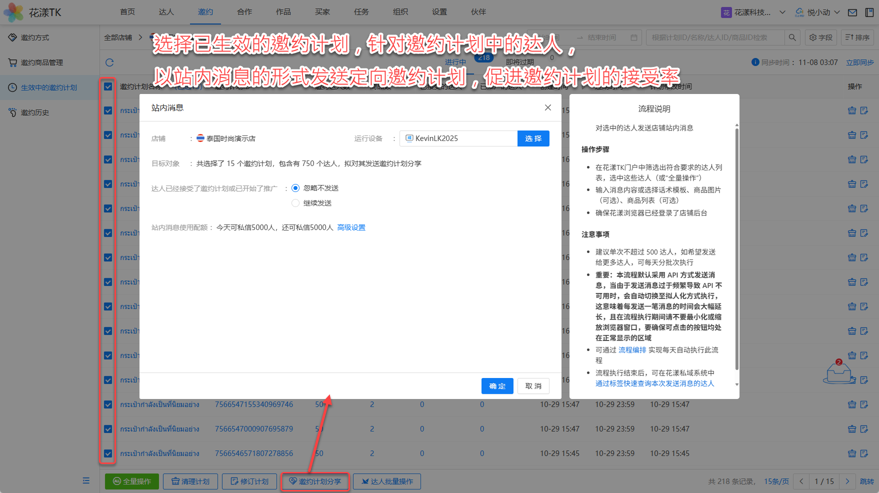 新版本允许用户批量选中当前生效的邀约计划,针对邀约计划中包含的达人发送站内消息,将该达人参与的邀约计划再次分享给达人: