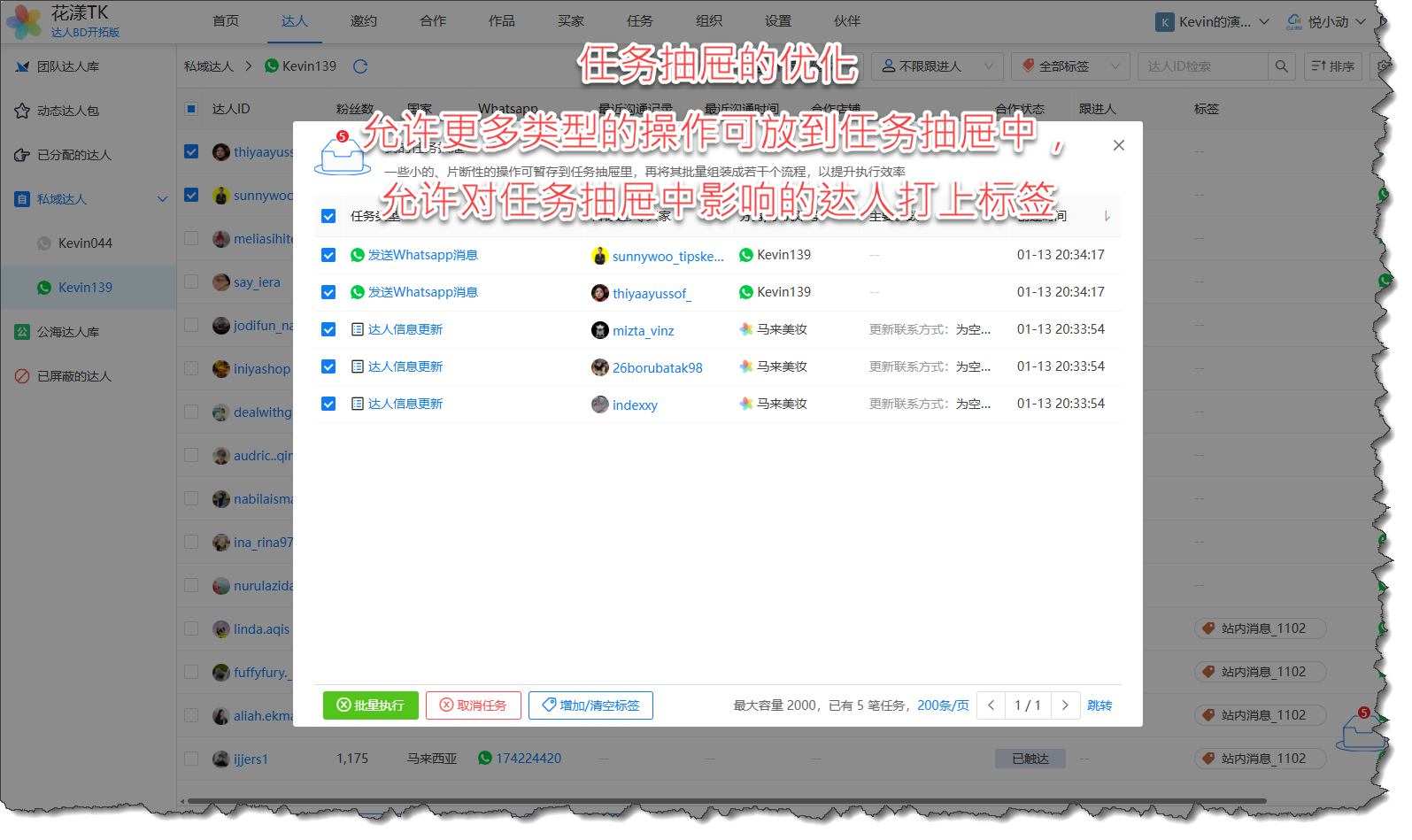 新版本对任务抽屉做了优化,允许更多类型的流程任务放到任务抽屉中,如加达人为即时消息好友、给达人发送即时消息等;同时,允许对任务抽屉中影响的达人打上标签,常用于:对一批索样请求通过的达人打上标签,方便事后查找这批达人。