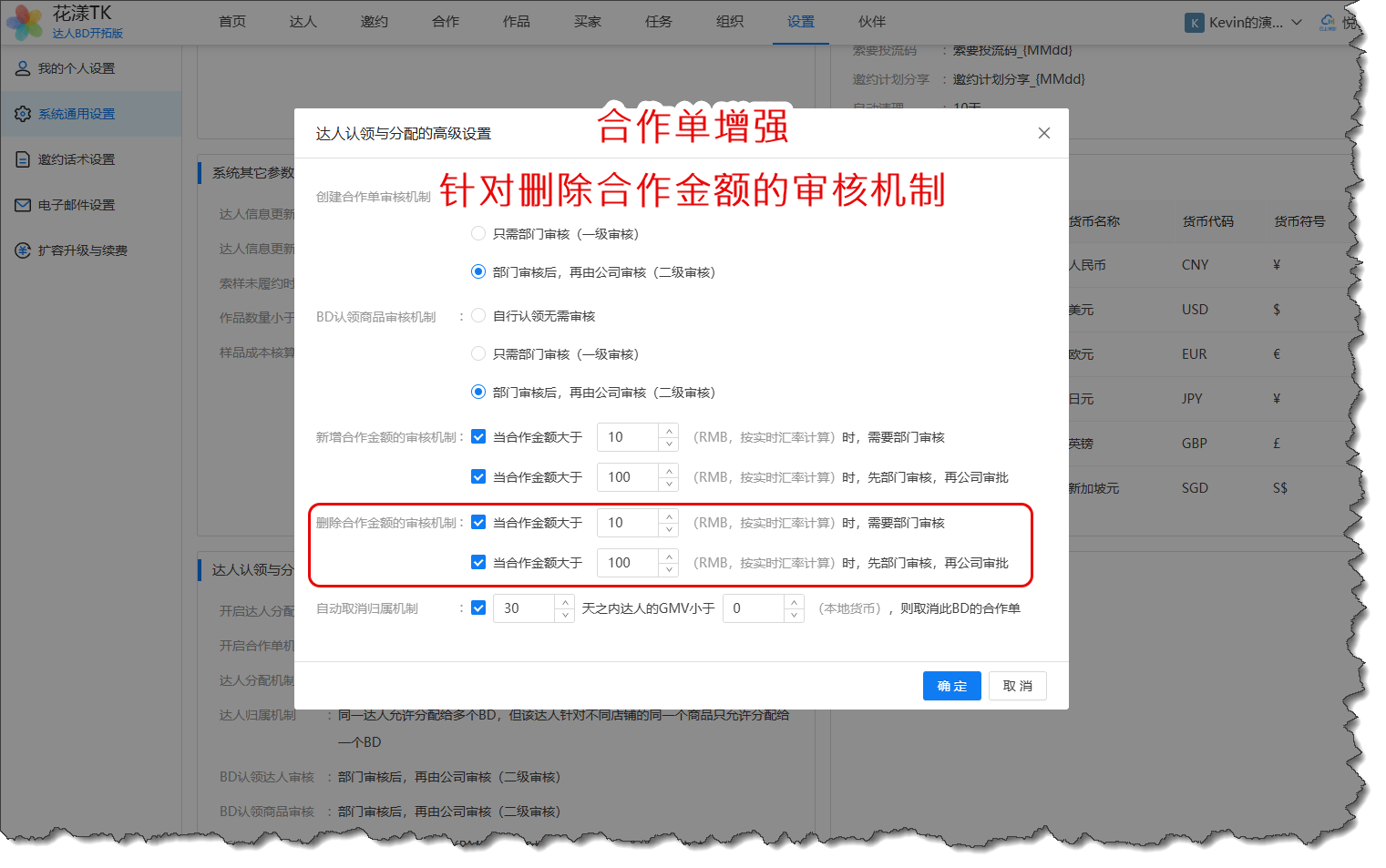 合作单是达人与BD(商务拓展)进行合作的纽带与数据记录的载体,能够详细记录BD与达人合作的所有细节;新版本针对合作单做了大幅优化,以删除合作金额为例,新版本提供了针对不同合作金额的审批机制: