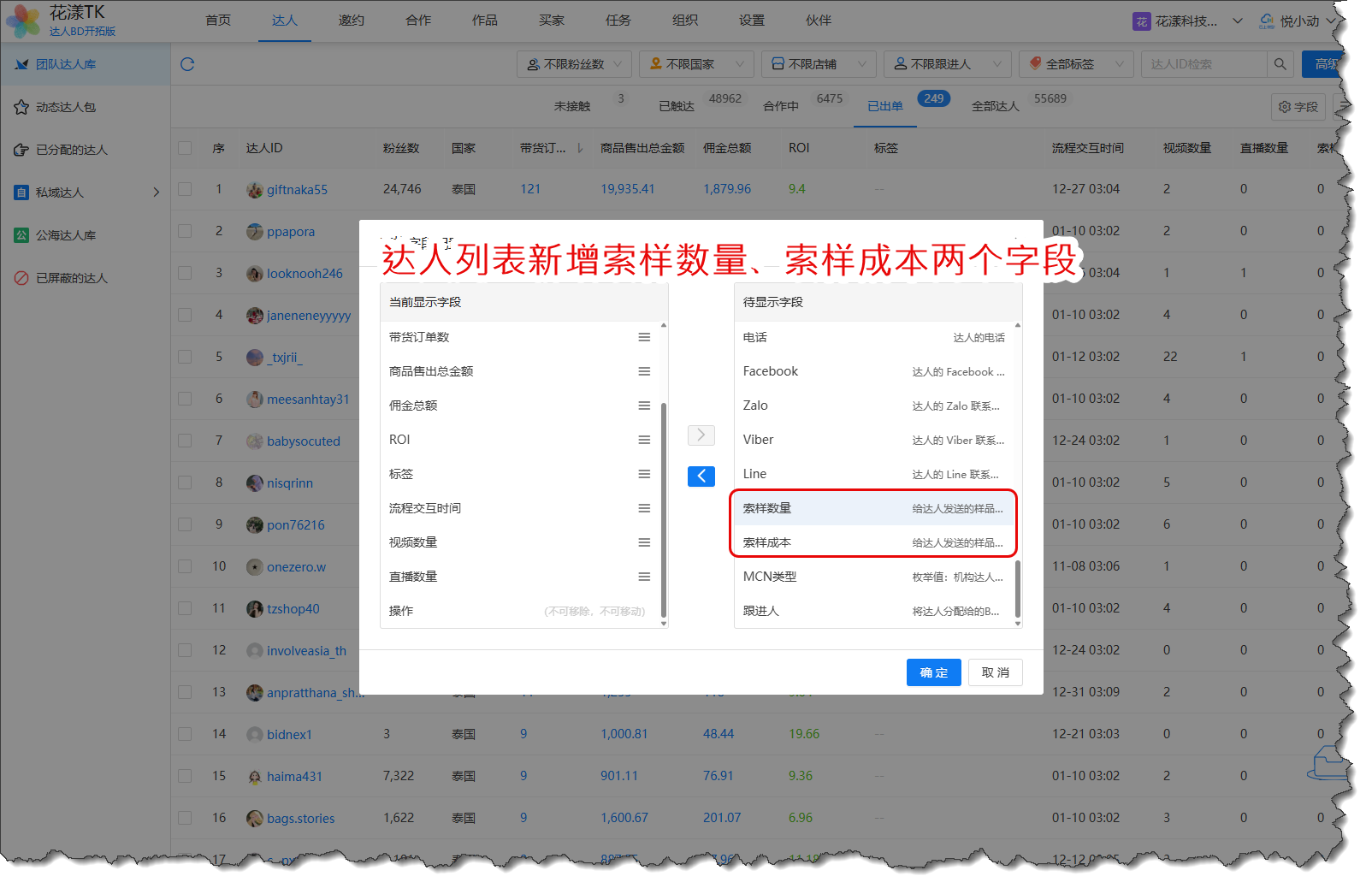 达人的“索样数量”与“索样成本”是卖家比较关心的属性,新版本支持在达人列表中直接展现这两个字段:
