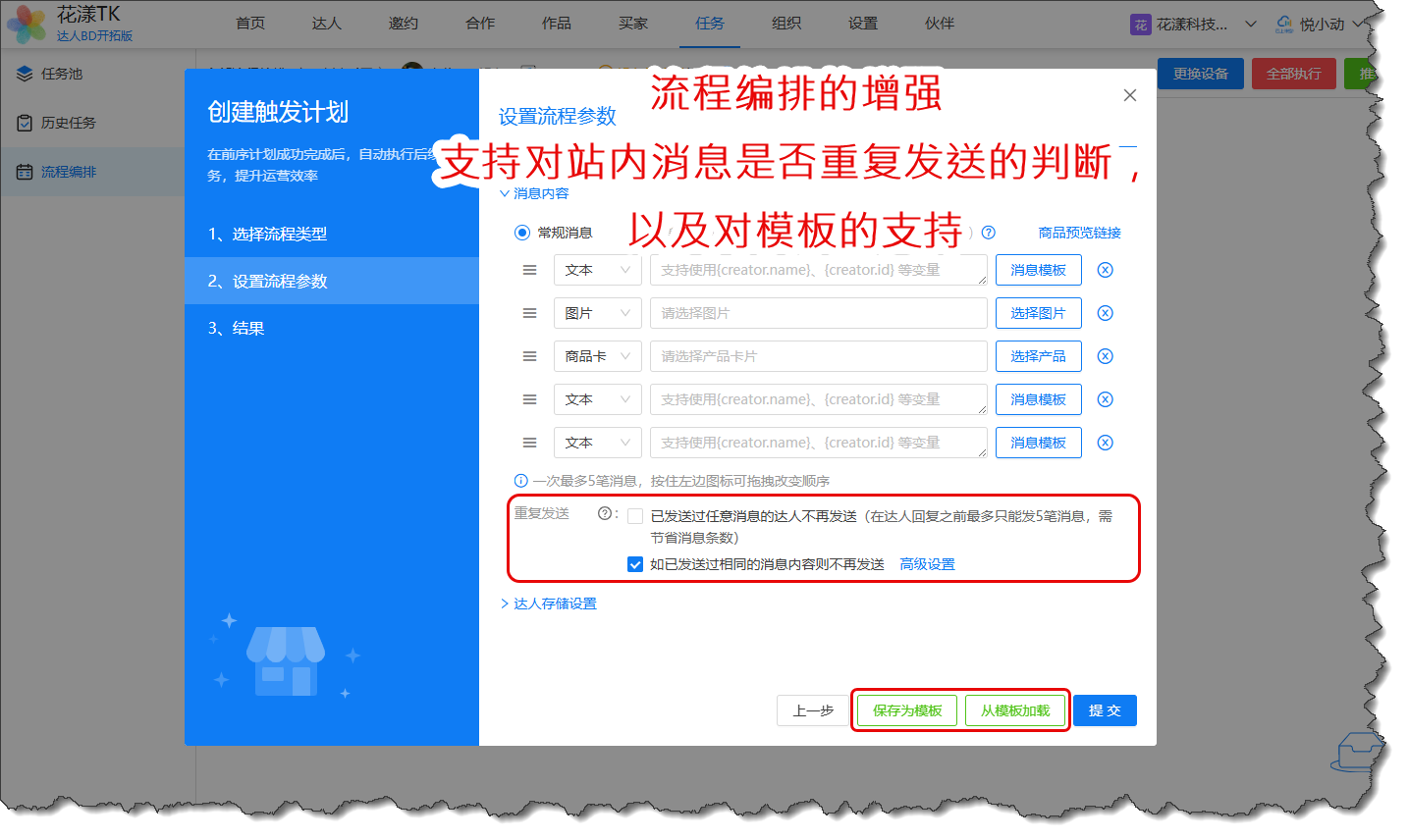 新版本针对流程编排做了增强,包括:在流程编排中可保存或加载定向邀约与站内消息流程模板;给达人发送站内消息时允许判断消息内容是否重复发送: