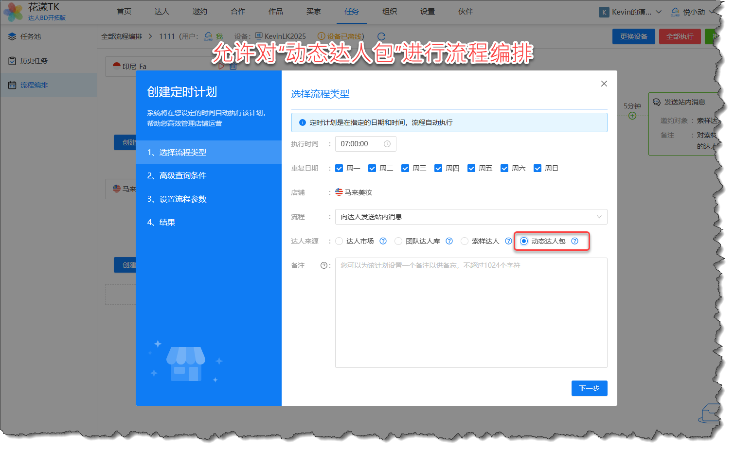 新版本增加了一个新的流程“已加橱窗的达人”,通过该流程能够自动查找这些挂过橱窗的达人,并由用户决定下一步动作,如:对这些达人进行定向邀约,或者向其发送站内消息,或者将其抓取下来存储到团队达人库中。