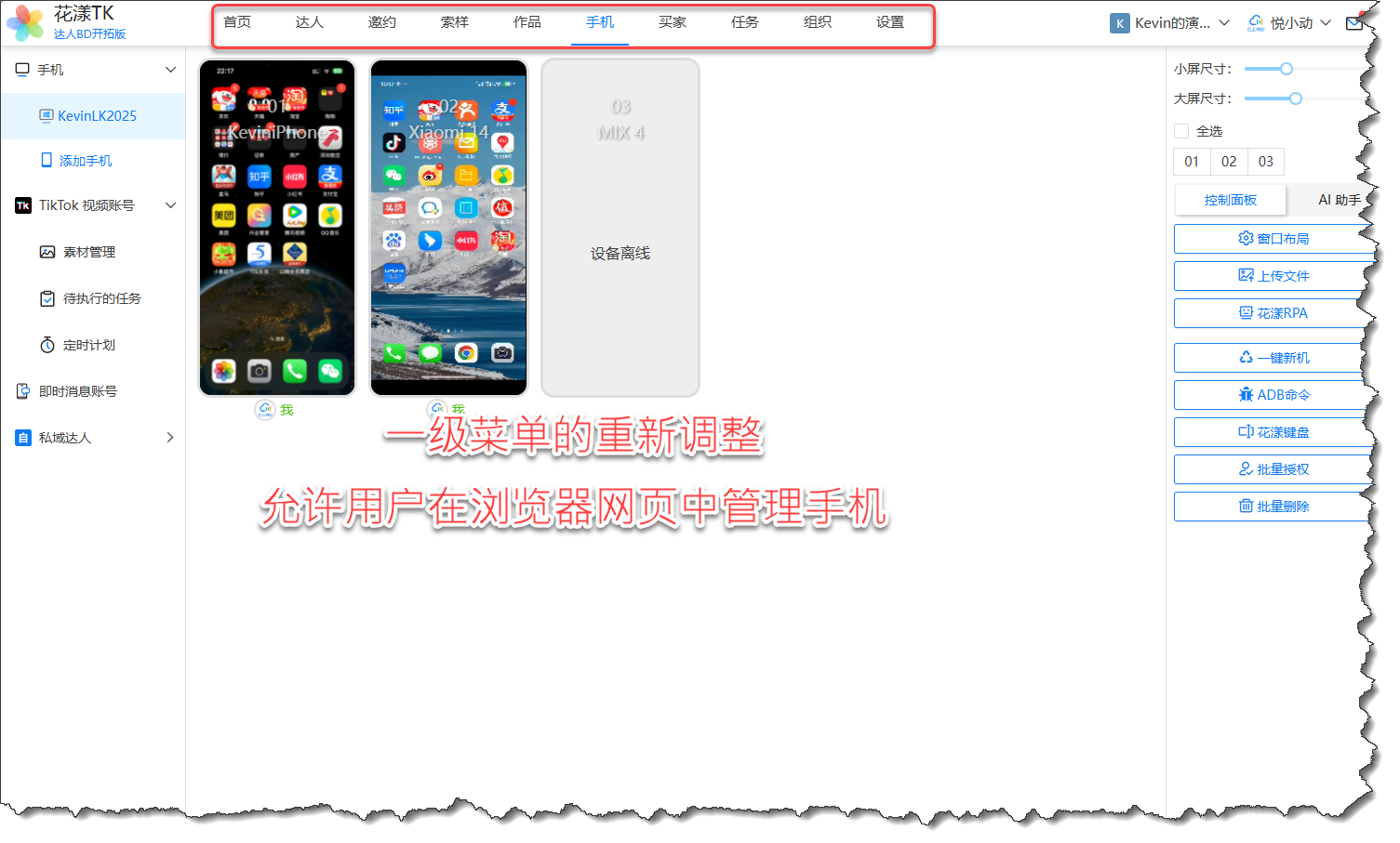 新版本对一级菜单做了调整,将 “合作” 更改为 “索样”,新增一级菜单 “手机”,并将 “首页” 中的 “短视频账号”、“即时消息账号”,迁移至 “手机” 菜单中,这样的调整对用户来说更易于理解:
