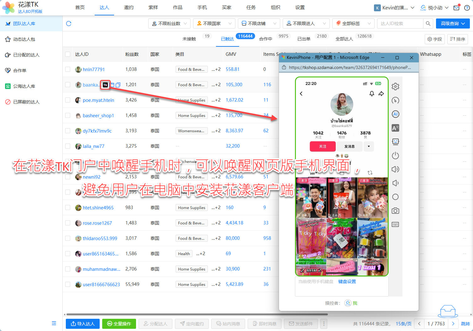 在花漾TK门户中弹出手机时,如一键打开达人的短视频首页,或者一键打开达人的即时消息聊天窗口时,允许弹出网页版手机界面,避免用户在电脑中强制安装花漾客户端: