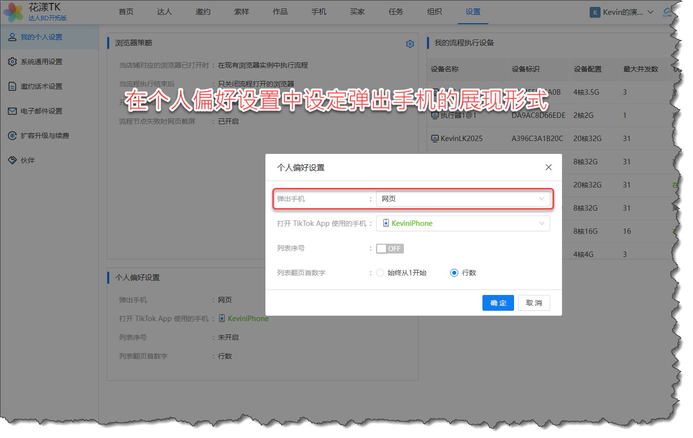 当然,用户可以在“个人偏好设置”中,设定弹出手机的展现形式: