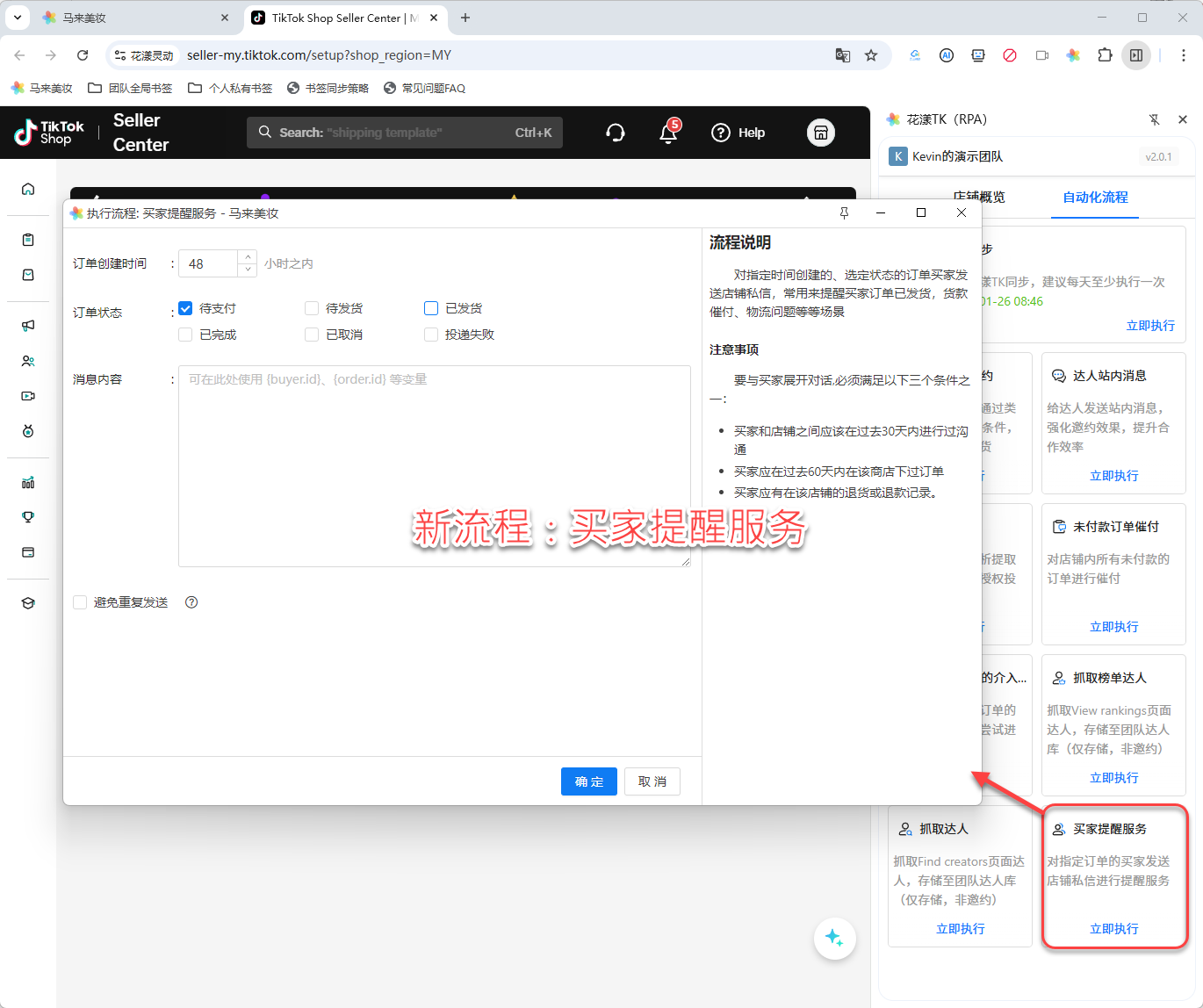 新版本上线了一个新的流程“买家提醒服务”,可以对指定时间创建的、选定状态的订单买家发送店铺私信,常用来提醒买家订单已发货,货款催付、物流问题等等场景: