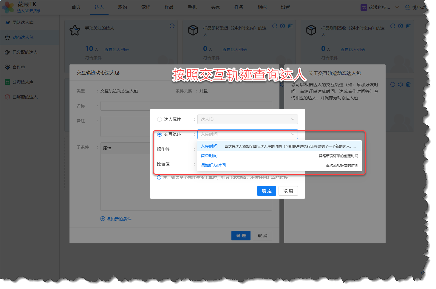 新版本增加了一种新的“动态达人包”类型:根据达人的交互轨迹对达人进行筛选。现阶段共支持三个交互轨迹,分别是: