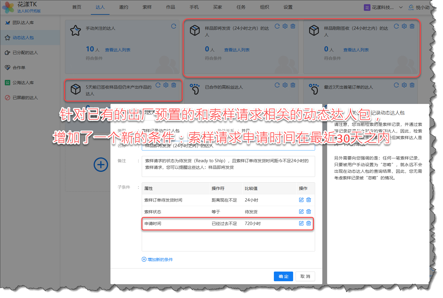 最后需要向您指出的是,新版本针对旧有的动态达人包(“样品即将发货(24小时之内)的达人”、“样品刚刚签收(24小时之内)的达人”、“5天前已签收样品但仍未产出作品的达人”)做了数据修复,补充了一个新的条件 “申请时间在最近30天之内”,进行修复的原因是:如果没有申请时间的过滤,会导致一旦很久之前有一笔符合过滤条件的索样请求,在后续都会看到这笔记录,这会给用户带来困扰。