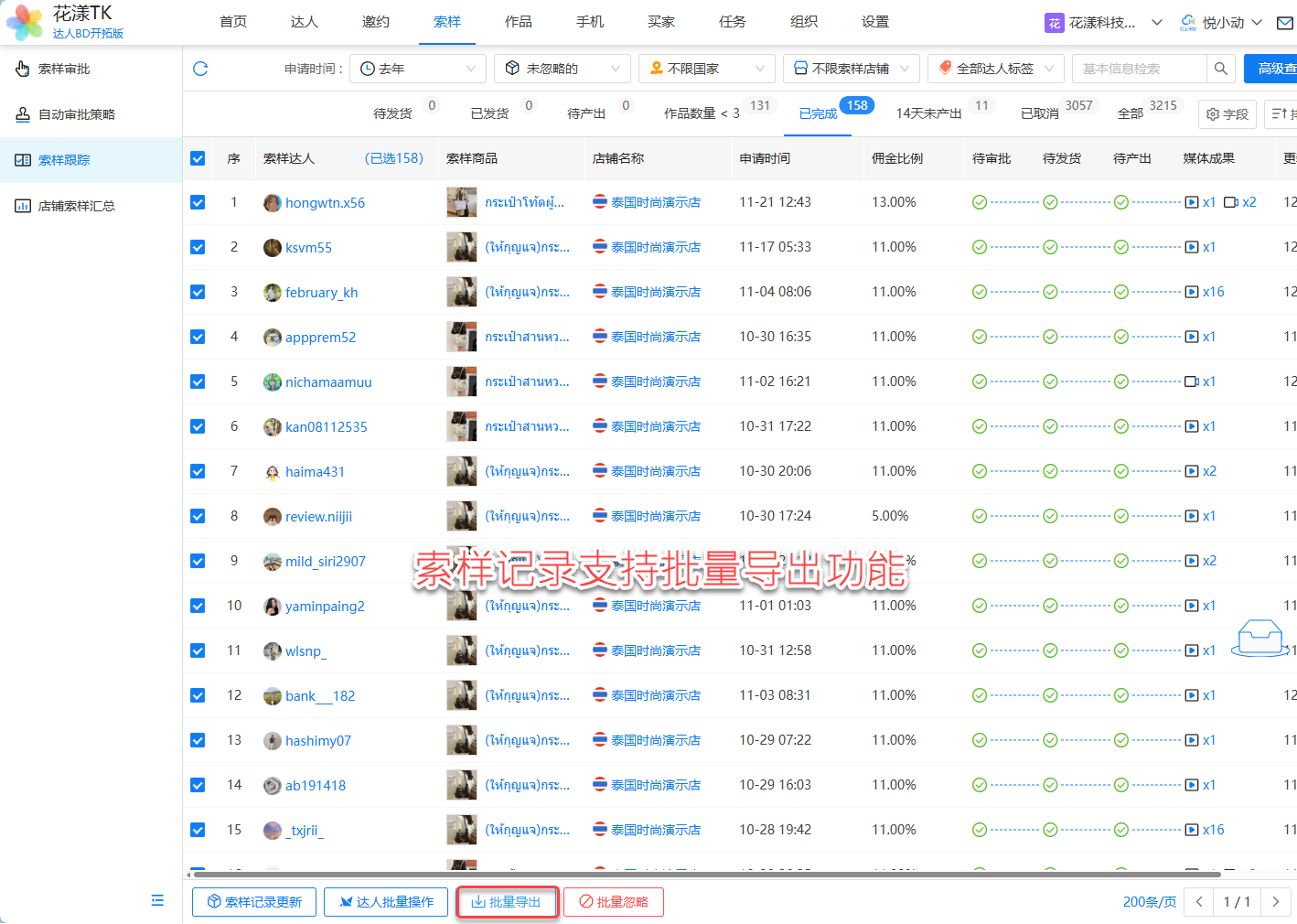 很多用户比较重视索样达人的类目,并希望能够根据类目筛选出达人,从而方便用户进行索样的审批工作,新版本支持通过类目进行索样达人的筛选: