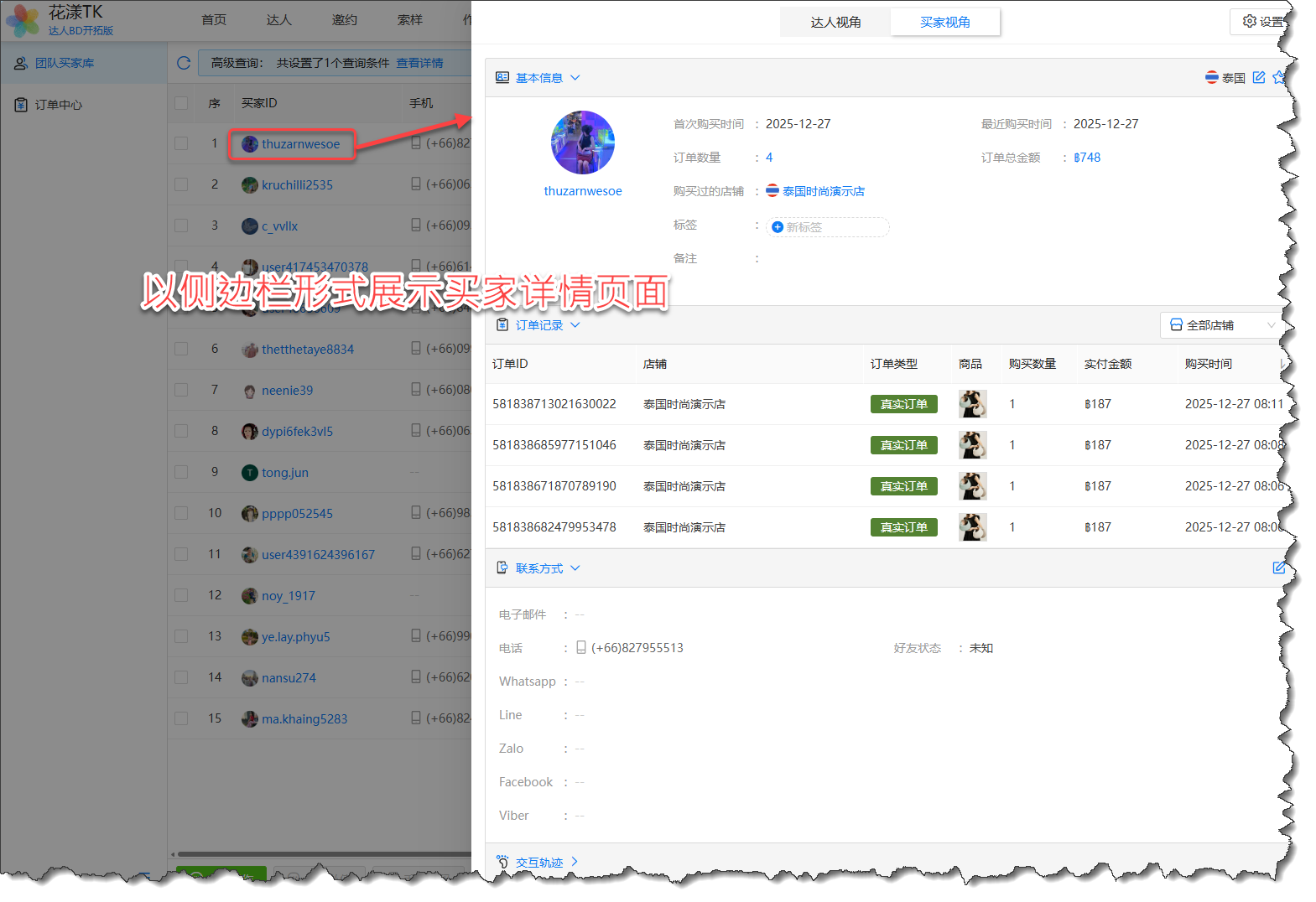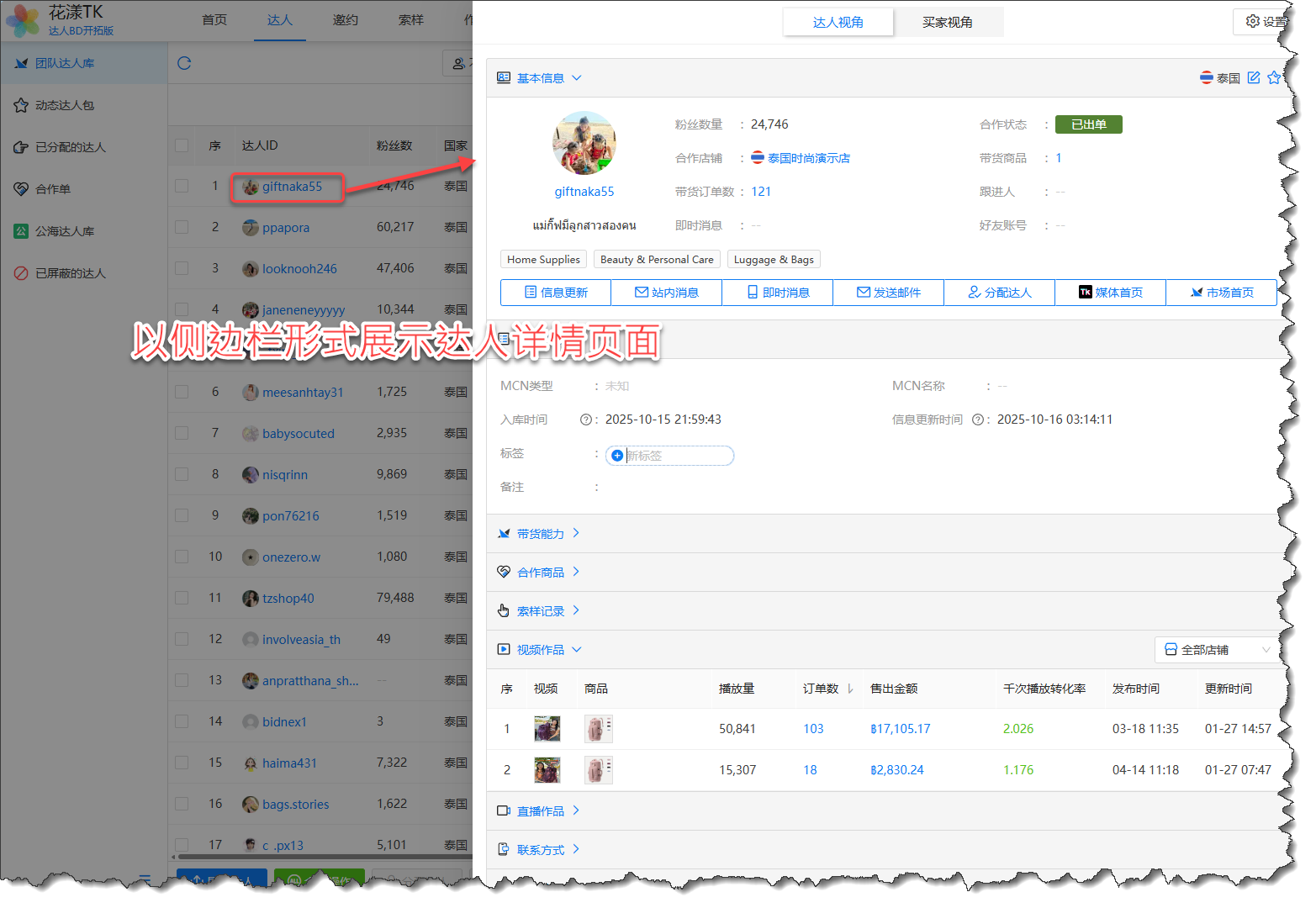 旧有版本中,点击达人 ID 或买家 ID,会以对话框形式展示达人或买家的详细信息,这种 UI 形态的缺点是展示面积小,操作不方便;新版本通过侧边栏形式展示达人与买家的详情页面: