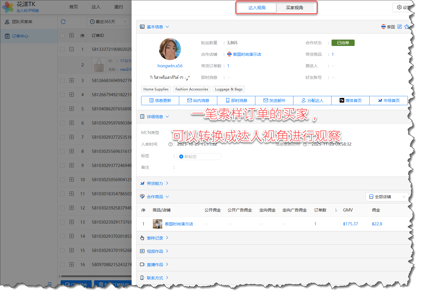 特别需要向您指出的是,某些场景下,一个 TikTok 用户到底是达人还是买家取决于观察它的角度,以索样订单为例,其买家本质就是达人。在新的 UI 形态下,针对同一个用户,我们可以轻松转换“达人视角”或者“买家视角”: