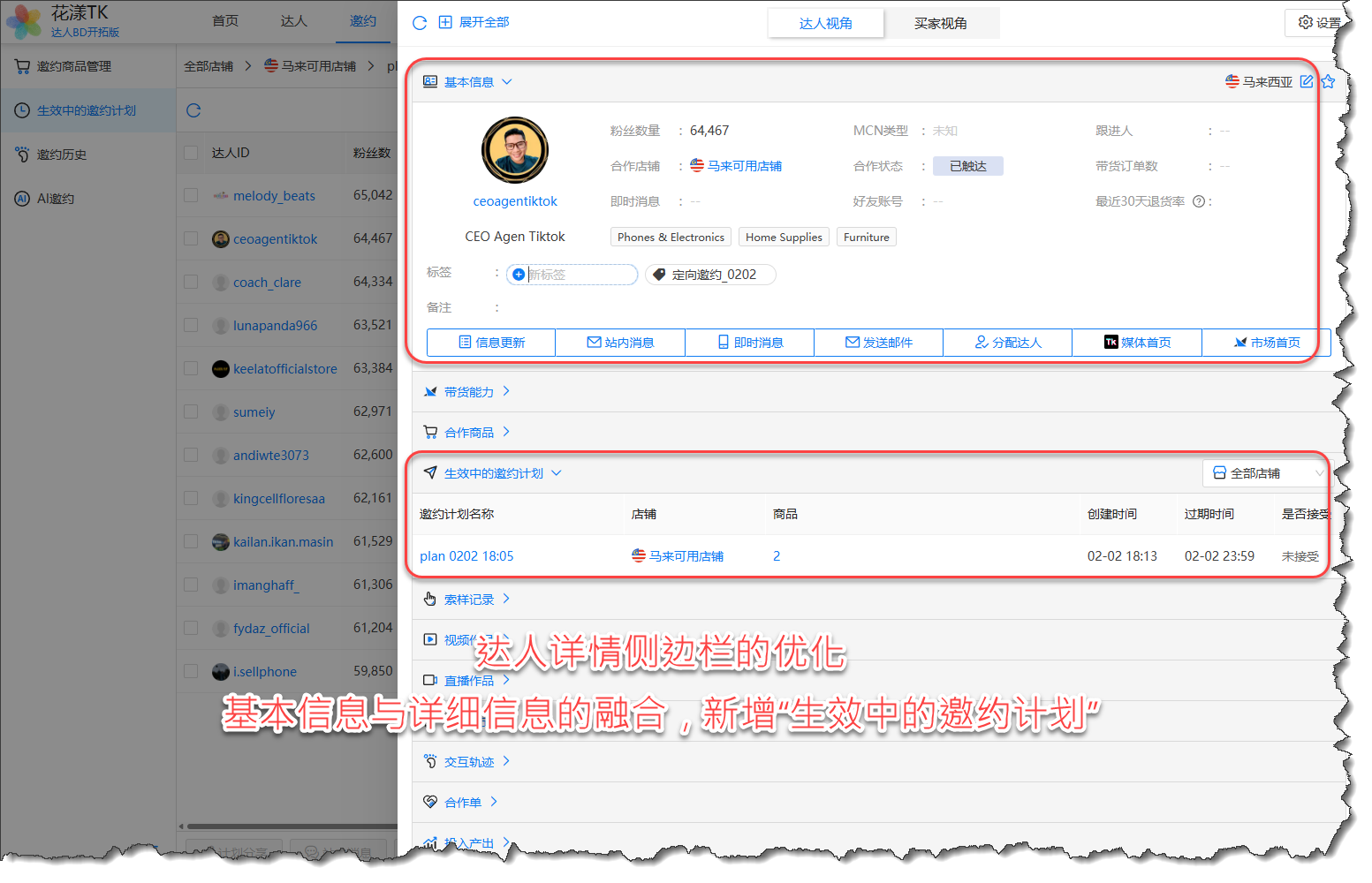 上一版本推出了通过“侧边栏”展示达人的详细信息,用户给予了正面反馈。新版本对达人详情的 UI 布局做了优化,包括将基本信息与详细信息合并,并增加了一个新的分组“生效中的邀约计划”,暨可以查看该达人在当前团队内所有店铺正在参与哪些定向邀约计划,方便用户了解达人和商品的佣金比例。