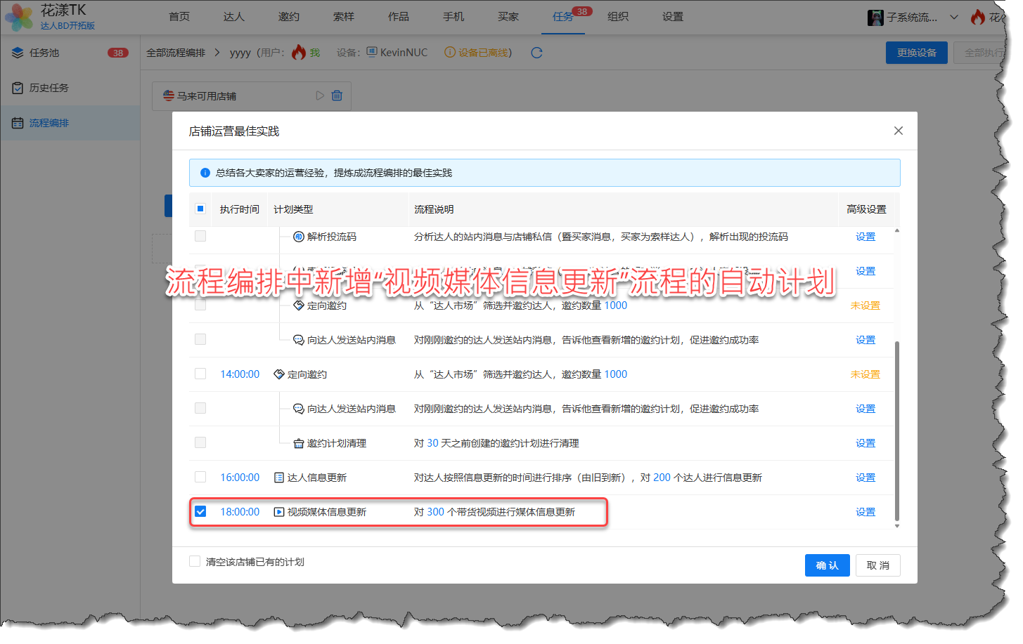 很多卖家朋友对视频的播放量、点赞量等数据非常敏感,希望花漾TK能够自动更新指定视频的媒体信息。新版本在流程编排中增加了一种新的计划类型:“视频媒体信息更新”,允许用户通过自动化流程抓取指定视频的播放量、点赞量、评论量等数据。