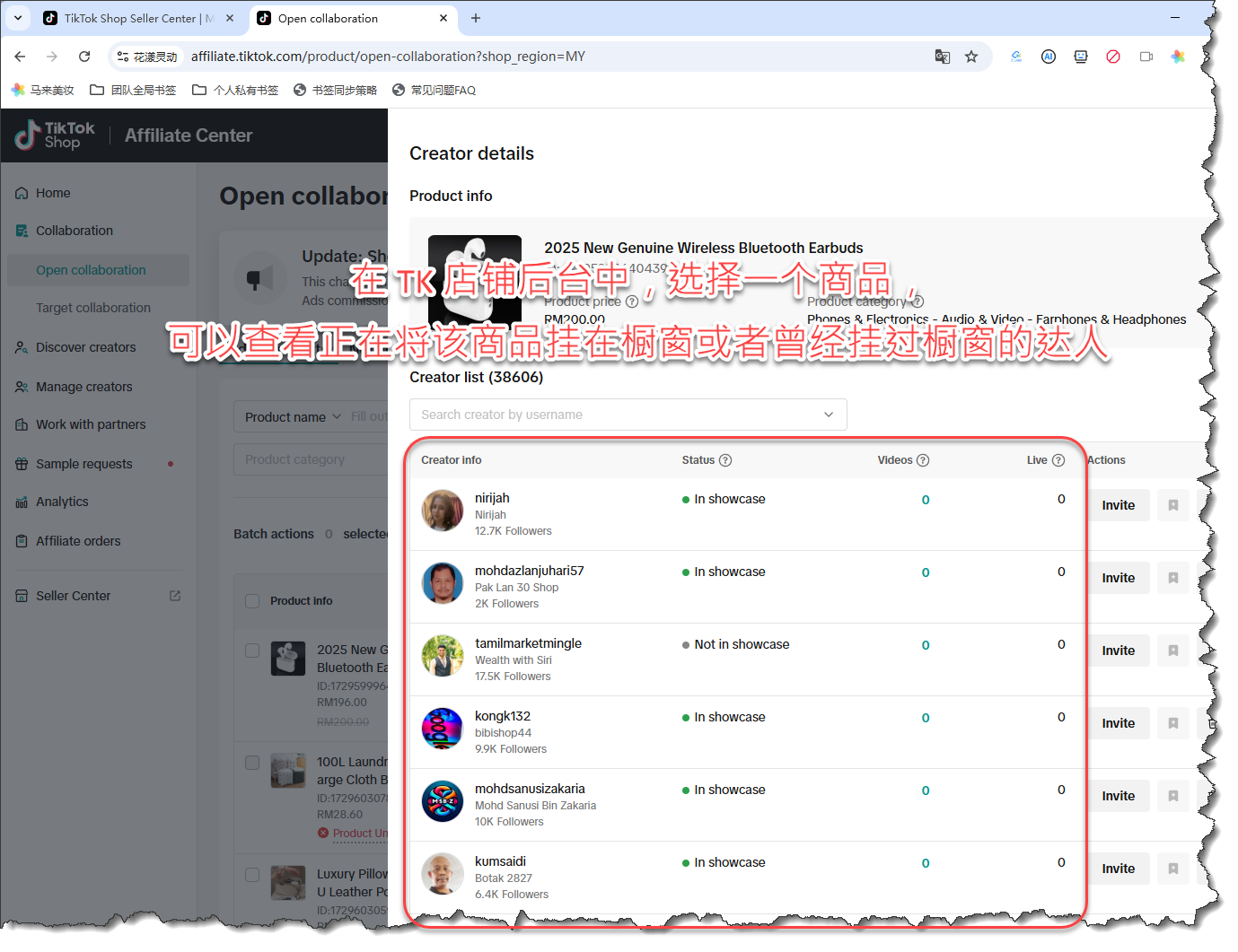 在店铺后台中,选择一个商品,可以查看正在将该商品挂在橱窗,或者曾经挂过橱窗的达人,如下图所示: