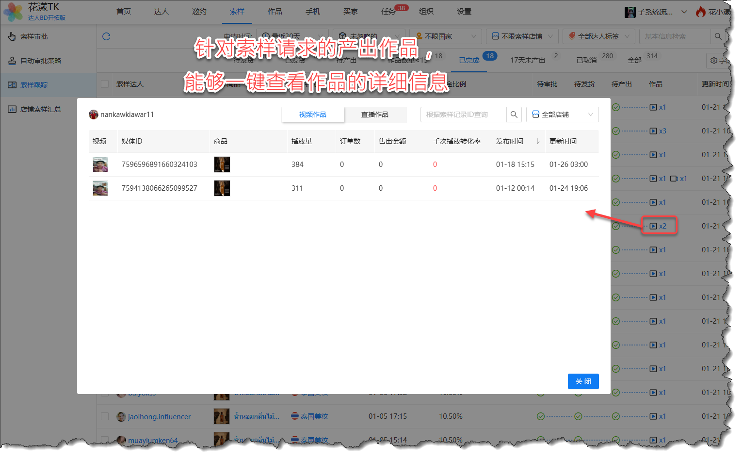 在索样跟踪中,为方便您查看该索样请求产出的所有作品,本版本专门优化了作品详情的展示窗口,能够直接查看作品产出的订单数、GMV等数据: