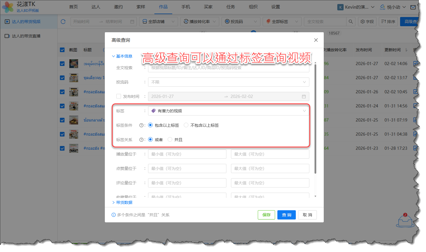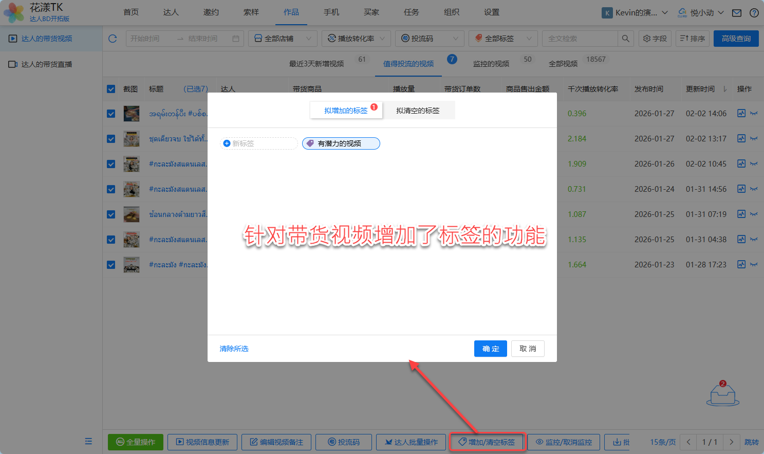 新版本针对达人的带货视频增加了标签功能,允许对视频打上标签,并能够通过标签进行视频的筛选: