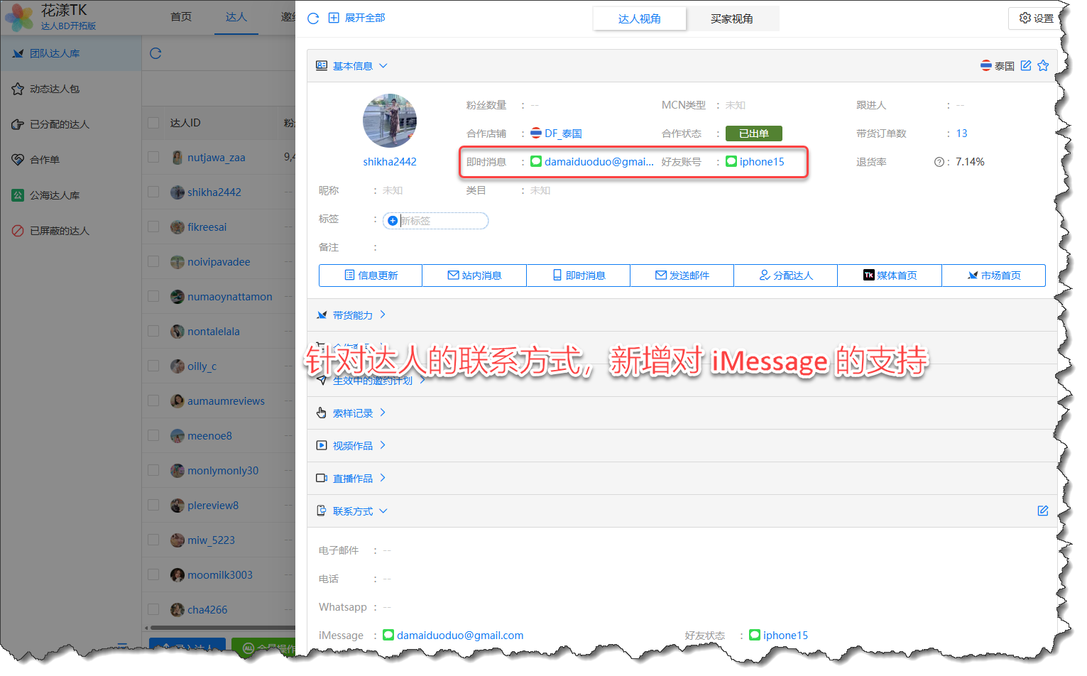 我们知道,很多美英达人会留下自己的 iMessage 账号(如:他们的 email 便是其苹果手机的 iCloud 账号);新版本增加了对苹果手机 iMessage 的支持,这意味着您可以通过苹果手机自动加达人为好友,或者自动给达人发送基于 iMessage 的即时消息: